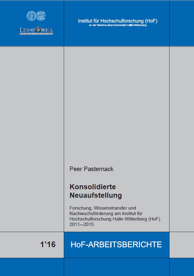 Peer Pasternack: Konsolidierte Neuaufstellung. Forschung‚ Wissenstransfer und Nachwuchsförderung am Institut für Hochschulforschung Halle‐Wittenberg (HoF) 2011 – 2015 (HoF‐Arbeitsbericht 1‘2016), Institut für Hochschulforschung Halle‐Wittenberg (HoF), Halle‐Wittenberg 2016, 124 S. ISSN 1436‐3550.
